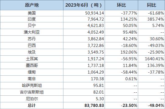 據(jù)海關(guān)統(tǒng)計(jì)數(shù)據(jù),2023年6月我國(guó)進(jìn)口棉花約8萬(wàn)噸,環(huán)比減少約3萬(wàn)噸,同比下降約49.0%。