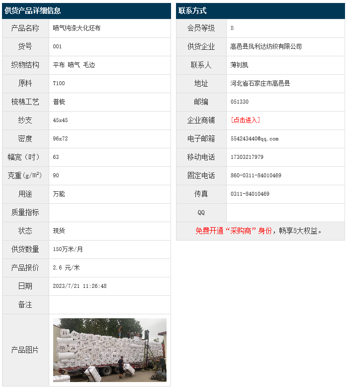7月21日,高邑縣鳳利達(dá)紡織有限公司大化純滌平布T100 45x45 96x72 63" 90g/㎡ 噴氣 毛邊,報(bào)價(jià)為2.6元/米,實(shí)際成交價(jià)以協(xié)商為準(zhǔn)。[點(diǎn)擊查看詳情]
