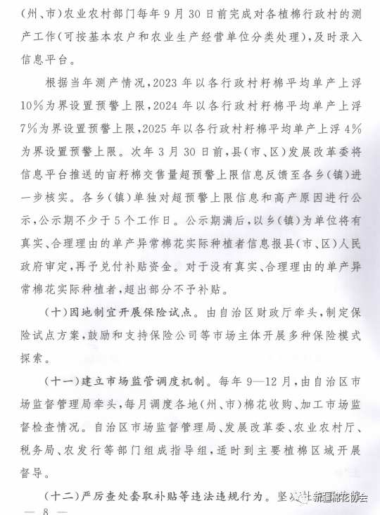 《新疆維吾爾自治區(qū)2023-2025年棉花目標價格政策實施方案》已經(jīng)自治區(qū)會議審議通過,現(xiàn)印發(fā)給你們,請結(jié)合實際認真貫徹落實。