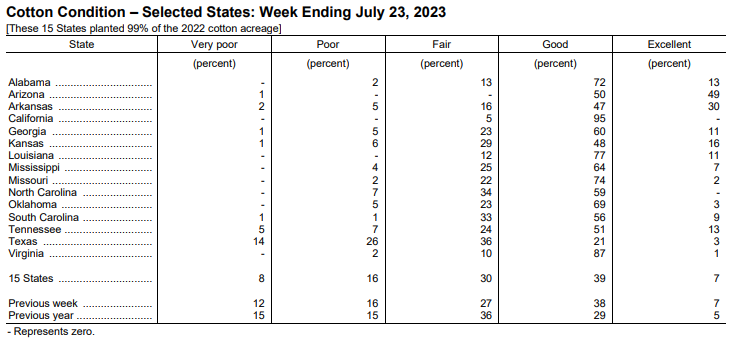 美國(guó)農(nóng)業(yè)部7月24日發(fā)布的美國(guó)棉花生長(zhǎng)報(bào)告顯示,截至7月23日當(dāng)周,美棉現(xiàn)蕾率為78%,前周為64%,去年同期為79%,五年均值為79%。美棉結(jié)鈴率為37%,前周為25%,去年同期為46%,五年均值為39%。美棉生長(zhǎng)優(yōu)良率為46%,前周為45%,去年同期為34%。