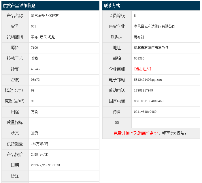 7月25日,高邑縣鳳利達(dá)紡織有限公司大化純滌平布T100 45x45 96x72 63" 90g/㎡ 噴氣 毛邊,報(bào)價(jià)為2.55元/米,實(shí)際成交價(jià)以協(xié)商為準(zhǔn)。[點(diǎn)擊查看詳情]