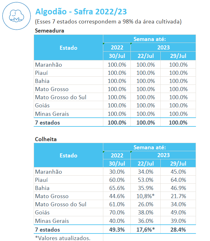 據(jù)巴西農(nóng)業(yè)部下屬的國家商品供應(yīng)公司CONAB,截至07月29日,巴西棉花收割率為28.4%,上周為17.6%,去年同期為49.3%。