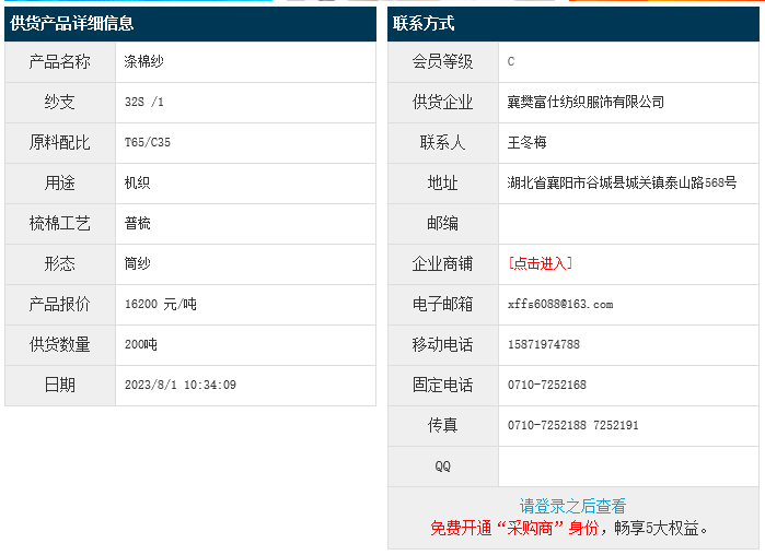 8月1日,襄樊富仕紡織服飾有限公司滌棉紗T65/C35 32S,報(bào)價(jià)為16200元/噸,實(shí)際成交價(jià)以協(xié)商為準(zhǔn)。[點(diǎn)擊查看詳情]