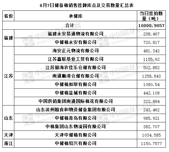 中國儲備棉管理有限公司定于8月7日通過全國棉花交易市場上市銷售儲備棉重量10000.9057噸,共32捆。具體庫點及數(shù)量見下表。