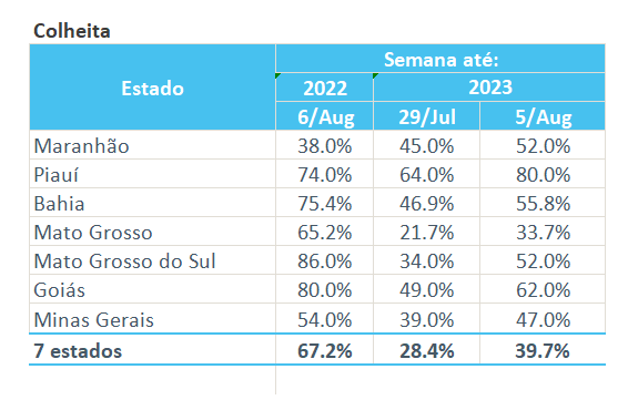 據(jù)巴西農(nóng)業(yè)部下屬的國家商品供應(yīng)公司CONAB,截至08月05日,巴西棉花收割率為39.7%,上周為28.4%,去年同期為67.2%。