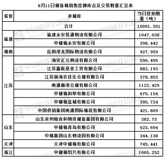 中國(guó)儲(chǔ)備棉管理有限公司定于8月11日通過(guò)全國(guó)棉花交易市場(chǎng)上市銷(xiāo)售儲(chǔ)備棉重量10001.351噸,共31捆。具體庫(kù)點(diǎn)及數(shù)量見(jiàn)下表。