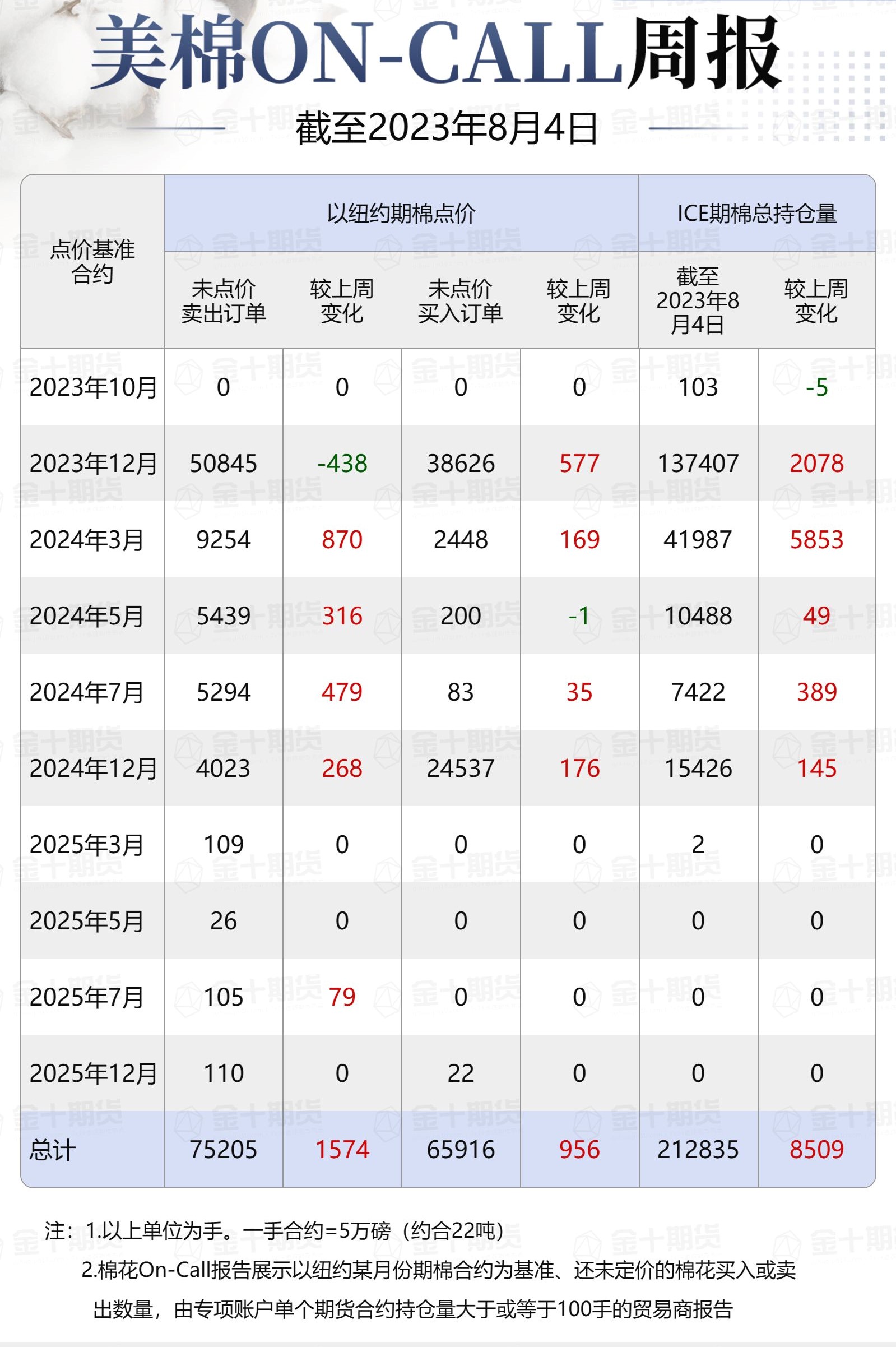 據美國商品期貨交易委員會(CFTC)最新數據,截至8月4日,①美棉On-Call未點價賣出訂單75205手,環(huán)比增加1574手;未點價買入訂單65916手,環(huán)比增加956手;②ICE期棉2310合約上賣方未點價合約為0手,較此前一周增加0手;③ICE期棉2312合約上賣方未點價合約為50845手,較此前一周減少438手;④ICE期棉2403合約上賣方未點價合約為9254手,較此前一周增加870手;⑤ICE期棉2405合約上賣方未點價合約為5439手,較此前一周增加316手;⑥ICE期棉2407合約上賣方未點價合約為5294手,較此前一周增加479手;⑦ICE棉花期貨盤面2023/24年度(8月至次年7月)的On-Call合約未點價賣出訂單為70832手,環(huán)比增加1227手。