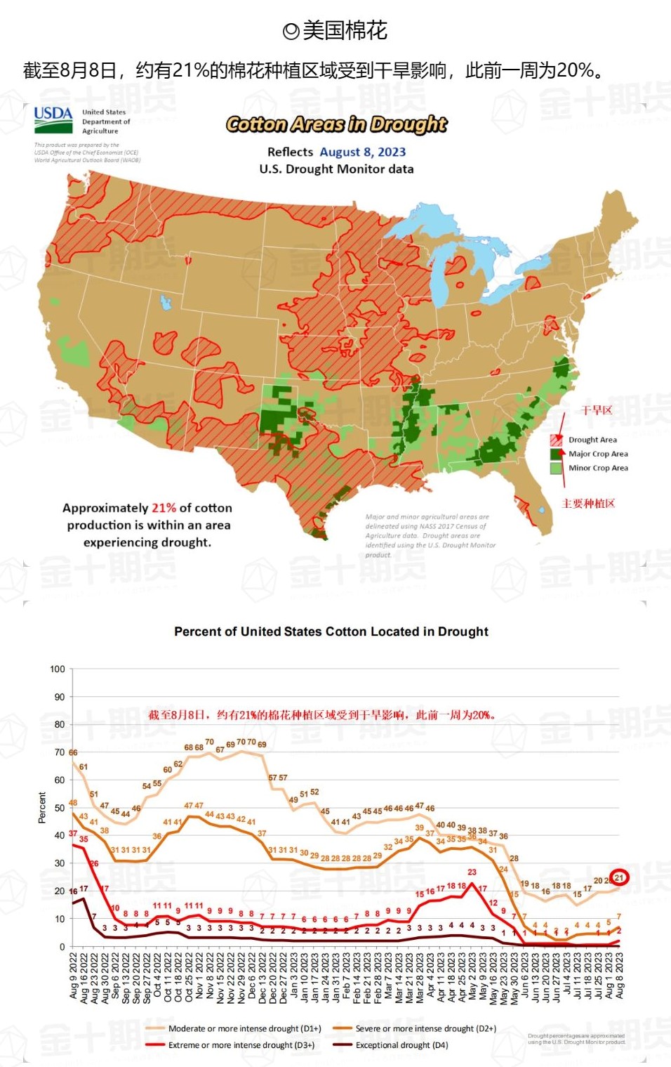 據(jù)USDA農(nóng)作物干旱報告:截至8月8日,美棉種植區(qū)域受干旱影響數(shù)據(jù)。