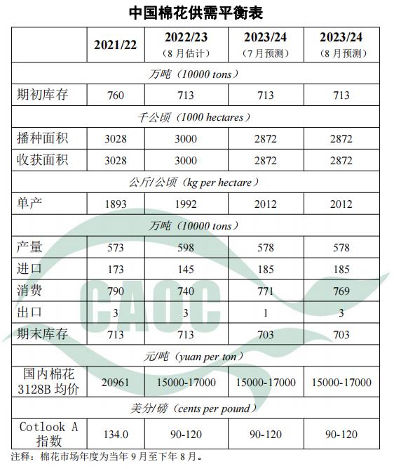 本月對(duì)2022/23年度及2023/24年度預(yù)測(cè)數(shù)據(jù)不作調(diào)整。至7月末,新疆棉區(qū)出現(xiàn)持續(xù)高溫天氣,對(duì)棉花花鈴成長造成一定不利影響,與往年同期相比,棉花伏桃數(shù)偏少、伏桃期縮短,黃河流域棉區(qū)墑情顯著改善,后期需持續(xù)關(guān)注天氣對(duì)棉花單產(chǎn)的影響。