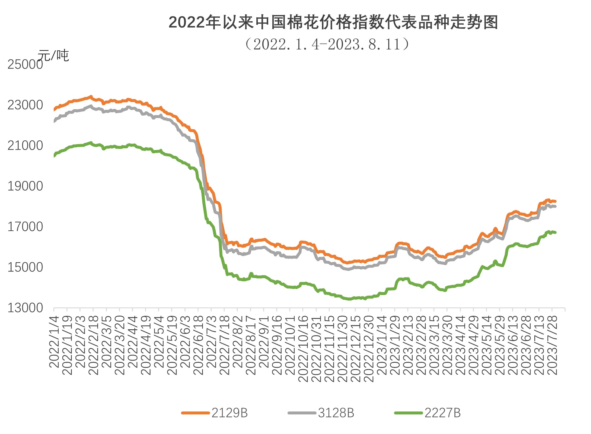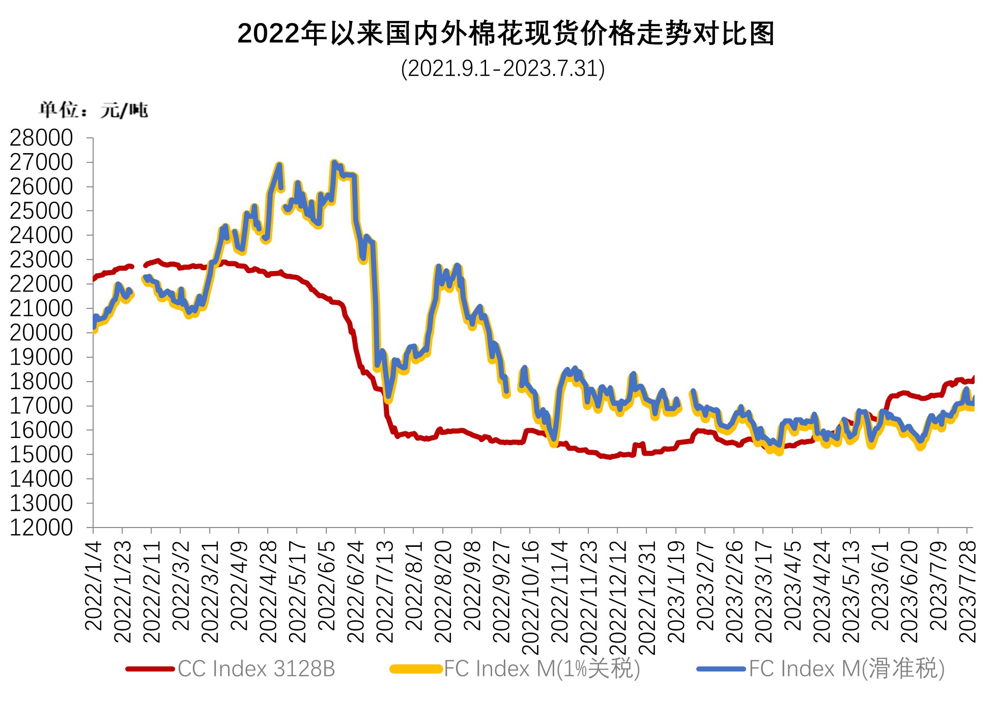 7月,國(guó)內(nèi)因主要棉區(qū)持續(xù)高溫天氣引發(fā)新棉減產(chǎn)預(yù)期,支撐棉價(jià)持續(xù)高位運(yùn)行,期現(xiàn)貨價(jià)格均創(chuàng)年度新高,中國(guó)棉花價(jià)格指數(shù)(CCIndex3128B)最高上漲至18070元/噸。月內(nèi),有關(guān)部門發(fā)布公告,為更好滿足棉紡企業(yè)用棉需求,將發(fā)放2023年棉花進(jìn)口滑準(zhǔn)稅配額,7月下旬開始組織銷售部分中央儲(chǔ)備棉。國(guó)際方面,受高溫降雨等不利天氣擾動(dòng),北半球主產(chǎn)棉國(guó)新棉減產(chǎn)預(yù)期增強(qiáng),棉價(jià)明顯上漲,但在經(jīng)濟(jì)衰退預(yù)期的影響下,出現(xiàn)寬幅震蕩走勢(shì),漲幅不及國(guó)內(nèi),內(nèi)外棉價(jià)差有所擴(kuò)大。