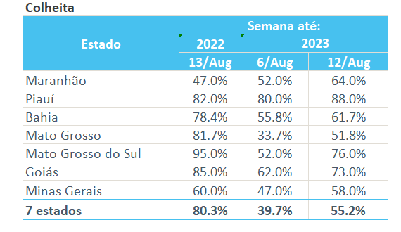 據(jù)巴西農(nóng)業(yè)部下屬的國家商品供應(yīng)公司CONAB,截至08月12日,巴西棉花收割率為55.2%,上周為39.7%,去年同期為80.3%。