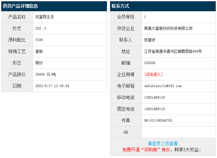 8月17日,南通大富豪紡織科技有限公司優(yōu)富再生滌純滌紗T100 32S,報價為20000元/噸,實際成交價以協(xié)商為準(zhǔn)。[點擊查看詳情]