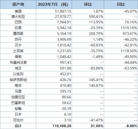 據(jù)海關統(tǒng)計數(shù)據(jù),2023年7月我國進口棉花約11萬噸,環(huán)比增加約3萬噸,同比下降約6.7%。