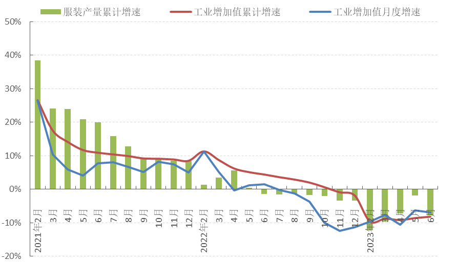 上半年,受市場需求復蘇乏力影響,春季傳統(tǒng)旺季訂單低于預期,2季度訂單不足問題更為突出,行業(yè)生產(chǎn)增速持續(xù)回落,規(guī)模以上企業(yè)工業(yè)增加值和服裝產(chǎn)量均呈負增長,降幅較2022年繼續(xù)加深。