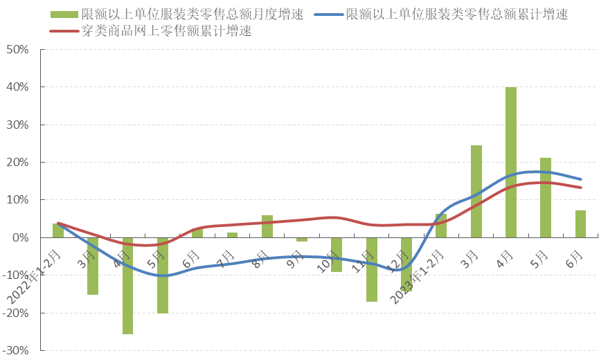上半年,國內(nèi)社會經(jīng)濟全面恢復常態(tài)化運行,居民收入增長快于國民經(jīng)濟,就業(yè)形勢大體穩(wěn)定,疊加一系列擴內(nèi)需促消費政策落地顯效,為消費回暖提供保障。我國服裝內(nèi)銷市場實現(xiàn)由降轉增變化,限額以上單位服裝類零售額回歸正增長,市場活力持續(xù)提升,消費需求逐漸釋放。