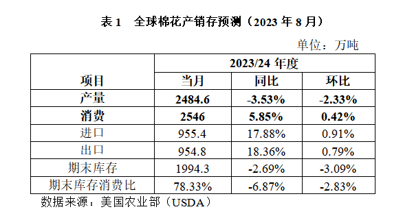 據(jù)美國農(nóng)業(yè)部8月預(yù)測,2023年度全球棉花產(chǎn)量2485萬噸,較上月下調(diào)59萬噸,降幅0.89%,同比減少91萬噸,降幅3.53%;全球棉花消費(fèi)量2546萬噸,較上月調(diào)增11萬噸,增幅0.42%,同比增加140萬噸,增幅5.85%;產(chǎn)需缺口擴(kuò)大至61萬噸;全球期末庫存消費(fèi)比為78.33%,較上月下降2.83個(gè)百分點(diǎn),同比下降6.87個(gè)百分點(diǎn)。