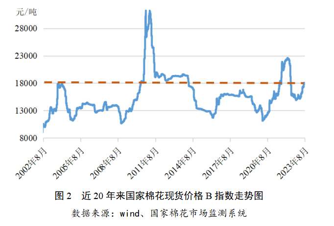 7月中旬以來,中共中央政治局會(huì)議釋放“擴(kuò)大消費(fèi)”的積極信號(hào),提振市場信心,隨著儲(chǔ)備棉輪出、增發(fā)棉花進(jìn)口滑準(zhǔn)稅配額政策相繼公布,儲(chǔ)備棉輪出期間紡織廠競拍積極,國內(nèi)棉價(jià)偏強(qiáng)震蕩為主。截至2023年8月16日,鄭州商品交易所棉花期貨主力合約結(jié)算價(jià)17010元/噸,較7月中旬上漲0.21%;代表內(nèi)地標(biāo)準(zhǔn)級(jí)皮棉市場價(jià)格的國家棉花價(jià)格B指數(shù)17992元/噸,較7月中旬上漲2.15%。