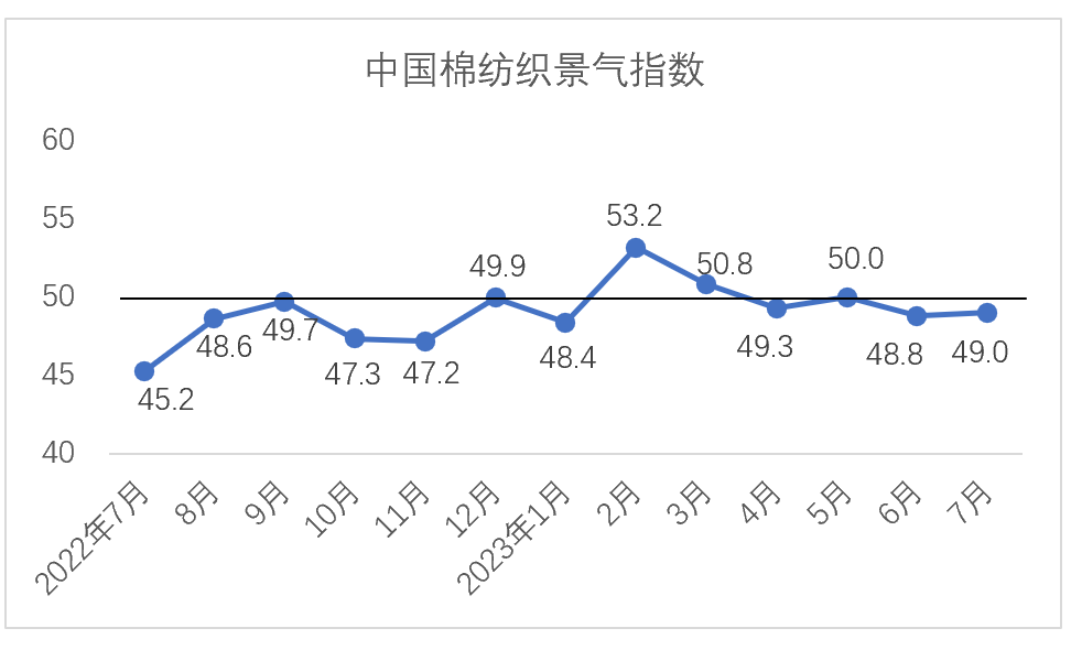 說(shuō)明:中國(guó)棉紡織行業(yè)景氣指數(shù)采集自全國(guó)近500家次棉紡織廠,參考國(guó)家制造業(yè)PMI等指數(shù)制定方式,通過(guò)對(duì)多個(gè)主要指標(biāo)加權(quán)計(jì)算得出,當(dāng)指數(shù)高于50,表示棉紡織行業(yè)本月景氣程度好于上月,低于50則表示本月景氣程度不及上月。