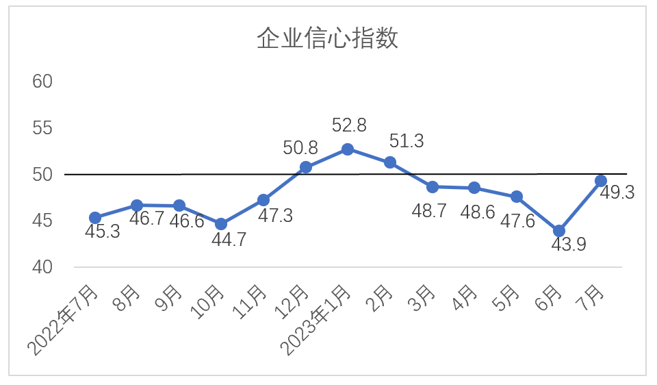 7月,企業(yè)信心指數(shù)為49.3,較6月上升5.4。7月24日,中共中央政治局召開(kāi)會(huì)議,提出要積極擴(kuò)大國(guó)內(nèi)需求,隨后國(guó)家發(fā)展改革委發(fā)布《關(guān)于恢復(fù)和擴(kuò)大消費(fèi)的措施》,形成促進(jìn)消費(fèi)的一攬子政策體系。同時(shí),中央儲(chǔ)備棉輪出政策公布,棉花進(jìn)口滑準(zhǔn)稅配發(fā)放75萬(wàn)噸,眾多利好消息傳向市場(chǎng),企業(yè)對(duì)于后市信心明顯增強(qiáng),信心指數(shù)大幅回升。