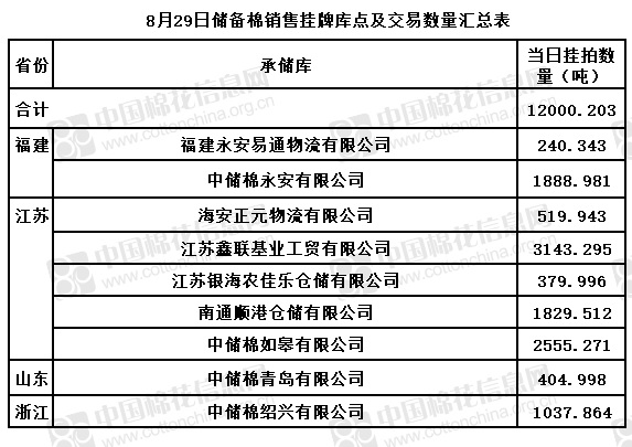 中國儲備棉管理有限公司定于8月29日通過全國棉花交易市場上市銷售儲備棉重量12000.203噸,共31捆。具體庫點及數(shù)量見下表。