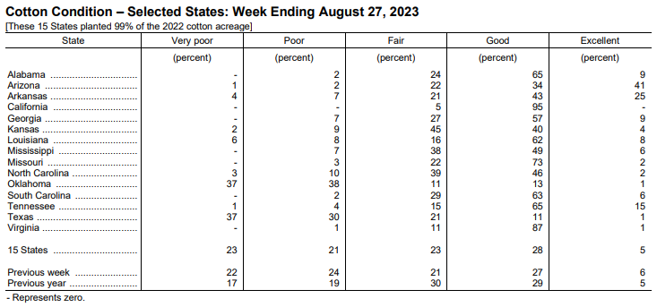 美國農(nóng)業(yè)部8月28日發(fā)布的美國棉花生長報告顯示,截至8月27日當周,美棉結(jié)鈴率為90%,前周為81%,去年同期為93%,五年均值為90%。美棉裂鈴率為25%,前周為18%,上年同期為27%,五年均值為25%。美棉生長優(yōu)良率為33%,前周為33%,去年同期為34%。