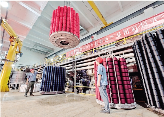 483顆鮮紅的筒子紗排成圓柱形從車間高空緩緩降落,8月29日上午,在紹興國周紡織整理有限公司一分廠染絲車間,國周集團第1000萬缸染色產品正式出缸,在印染行業(yè)承壓之時傳遞出老牌企業(yè)的擔當與信心。國周集團旗下紡織板塊集新材料研發(fā)、印染、色紡等業(yè)務于一體,從越城區(qū)搬遷集聚至柯橋后,已投產1年多時間。今年公司創(chuàng)新推出彩色纖維現貨業(yè)務,所染纖維色澤鮮艷、色譜齊全、色牢度好,對纖維損傷小,可紡性優(yōu),主要應用于棉紡、半精紡、花式紗、無紡布等行業(yè),目前已有超過500個顏色的現貨可供應。