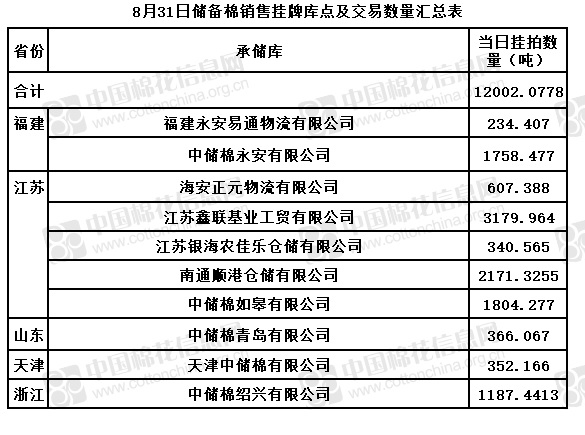 中國儲備棉管理有限公司定于8月31日通過全國棉花交易市場上市銷售儲備棉重量12002.0778噸,共32捆。具體庫點及數(shù)量見下表。