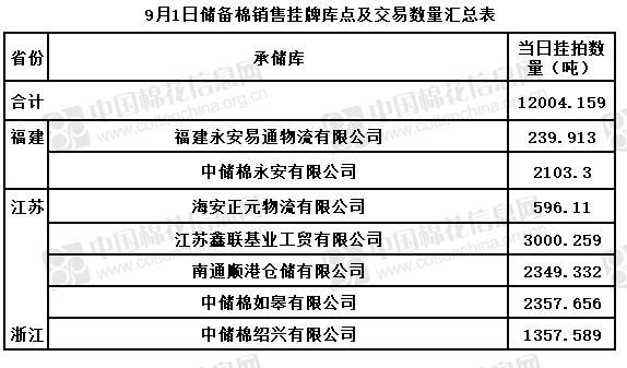 中國儲備棉管理有限公司定于9月1日通過全國棉花交易市場上市銷售儲備棉重量12004.159噸,共30捆。具體庫點(diǎn)及數(shù)量見下表。