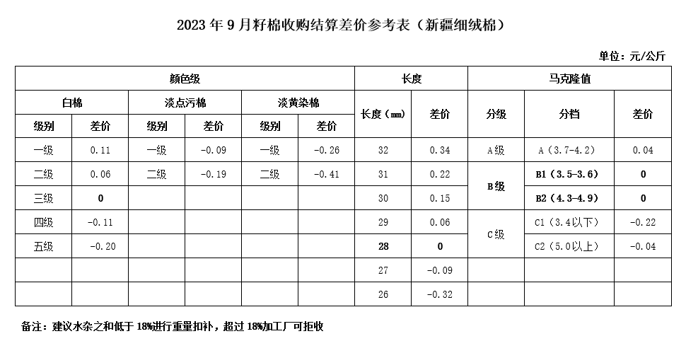 依據(jù)中國棉花協(xié)會(huì)發(fā)布的2023年9月《鋸齒加工細(xì)絨棉質(zhì)量差價(jià)表》和中國棉花預(yù)警系統(tǒng)2022年9月-2023年1月新疆籽棉收購平均衣分率數(shù)據(jù),折算得出籽棉收購差價(jià),現(xiàn)正式發(fā)布2023年9月《籽棉收購結(jié)算差價(jià)參考表(新疆細(xì)絨棉)》(單位:元/公斤),為新疆地區(qū)籽棉收購提供參考。