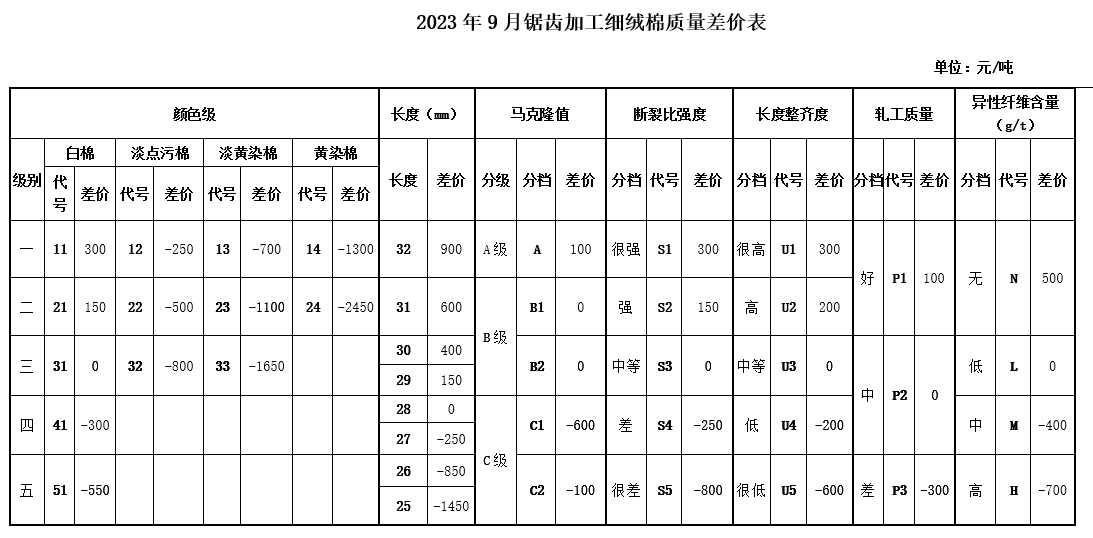 根據(jù)《中國棉花協(xié)會國產(chǎn)棉質(zhì)量差價表管理辦法》規(guī)定,現(xiàn)正式發(fā)布2023年9月《鋸齒加工細(xì)絨棉質(zhì)量差價表》、《皮輥加工細(xì)絨棉質(zhì)量差價表》和《長絨棉質(zhì)量差價表》(單位:元/噸)。