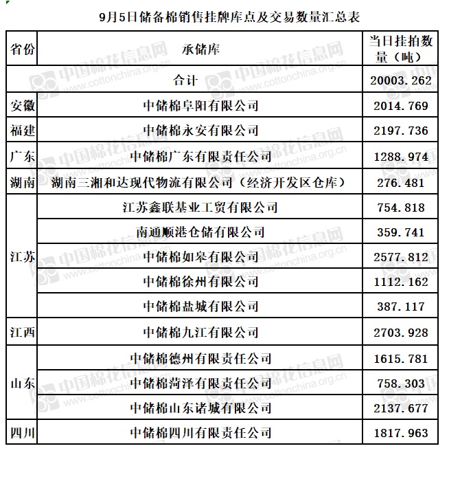 中國(guó)儲(chǔ)備棉管理有限公司定于9月5日通過(guò)全國(guó)棉花交易市場(chǎng)上市銷售儲(chǔ)備棉重量20003.262噸,共58捆。具體庫(kù)點(diǎn)及數(shù)量見(jiàn)下表。