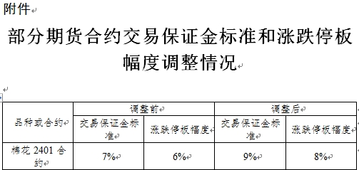 根據(jù)《鄭州商品交易所期貨交易風(fēng)險(xiǎn)控制管理辦法》第九條規(guī)定,經(jīng)研究決定,自2023年9月7日結(jié)算時(shí)起,棉花期貨2401合約的交易保證金標(biāo)準(zhǔn)調(diào)整為9%,漲跌停板幅度調(diào)整為8%。