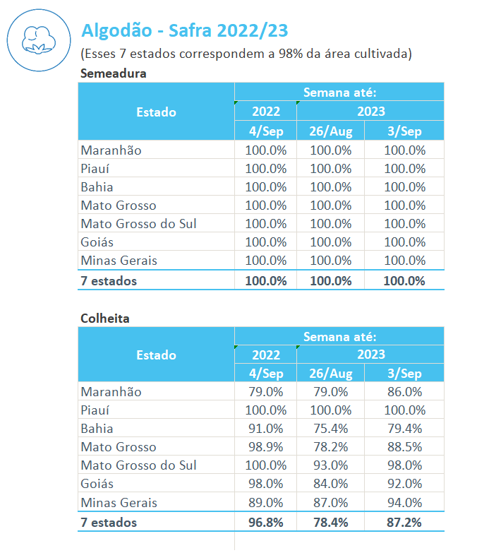 據(jù)巴西農(nóng)業(yè)部下屬的國家商品供應(yīng)公司CONAB,截至9月03日,巴西棉花收割率為87.2%,上周為78.4%,去年同期為96.8%。