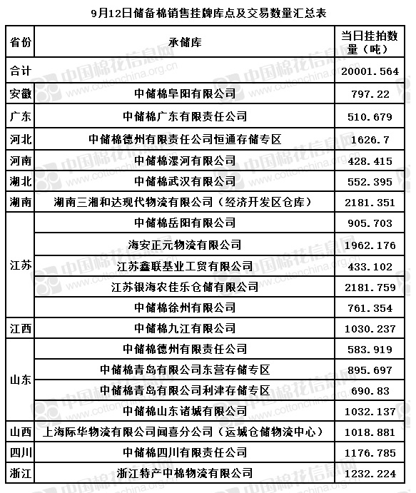 中國儲備棉管理有限公司定于9月12日通過全國棉花交易市場上市銷售儲備棉重量20001.564噸,共62捆。具體庫點及數量見下表。