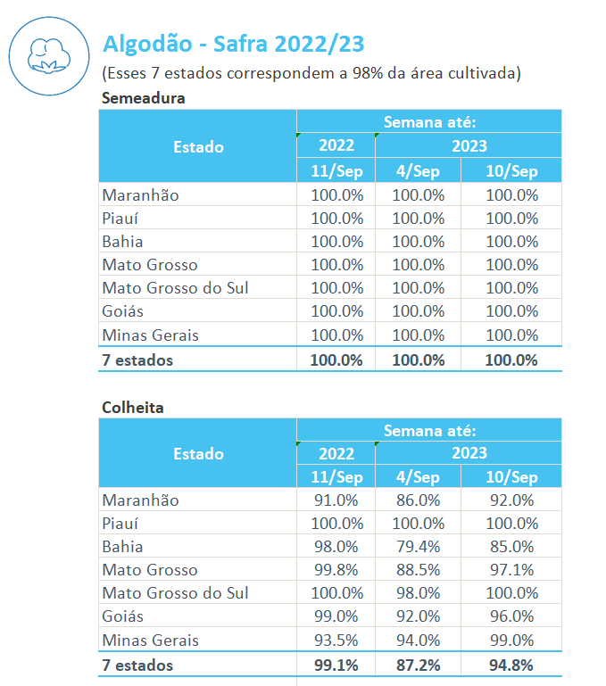 據(jù)巴西農(nóng)業(yè)部下屬的國(guó)家商品供應(yīng)公司CONAB,截至9月10日,巴西棉花收割率為94.8%,上周為87.2%,去年同期為99.1%。