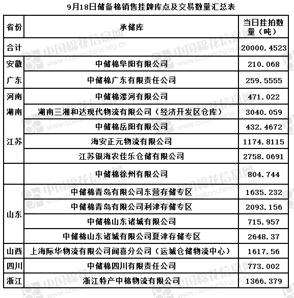 中國(guó)儲(chǔ)備棉管理有限公司定于9月18日通過(guò)全國(guó)棉花交易市場(chǎng)上市銷(xiāo)售儲(chǔ)備棉重量20000.4523噸,共60捆。具體庫(kù)點(diǎn)及數(shù)量見(jiàn)下表。