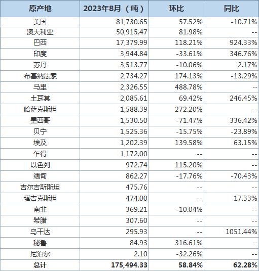據(jù)海關(guān)統(tǒng)計(jì)數(shù)據(jù),2023年8月我國(guó)進(jìn)口棉花約18萬(wàn)噸,環(huán)比增加約7萬(wàn)噸,同比增長(zhǎng)約62.3%。