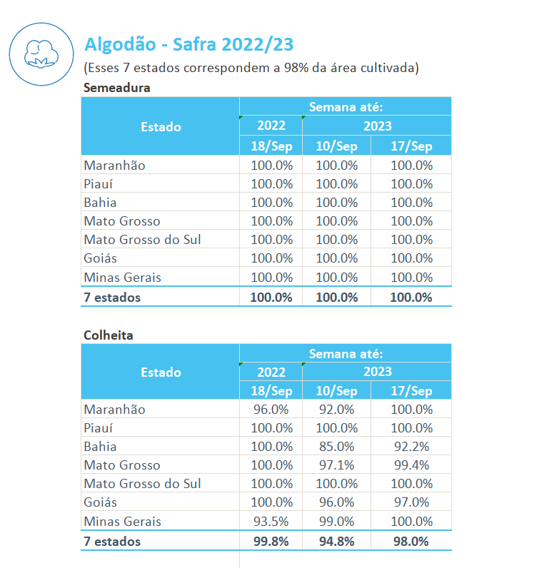 據(jù)巴西農(nóng)業(yè)部下屬的國(guó)家商品供應(yīng)公司CONAB,截至9月17日,巴西棉花收割率為98%,上周為94.8%,去年同期為99.8%。