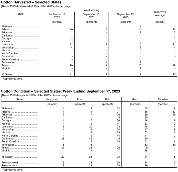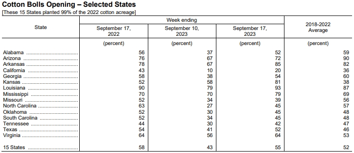 美國農(nóng)業(yè)部9月18日發(fā)布的美國棉花生長報告顯示,截至9月17日當(dāng)周,美棉裂鈴率為55%,前周為43%,上年同期為58%,五年均值為52%。美棉收割率為9%,前周為8%,去年同期為11%,五年均值為10%。美棉生長優(yōu)良率為29%,前周為29%,去年同期為33%。