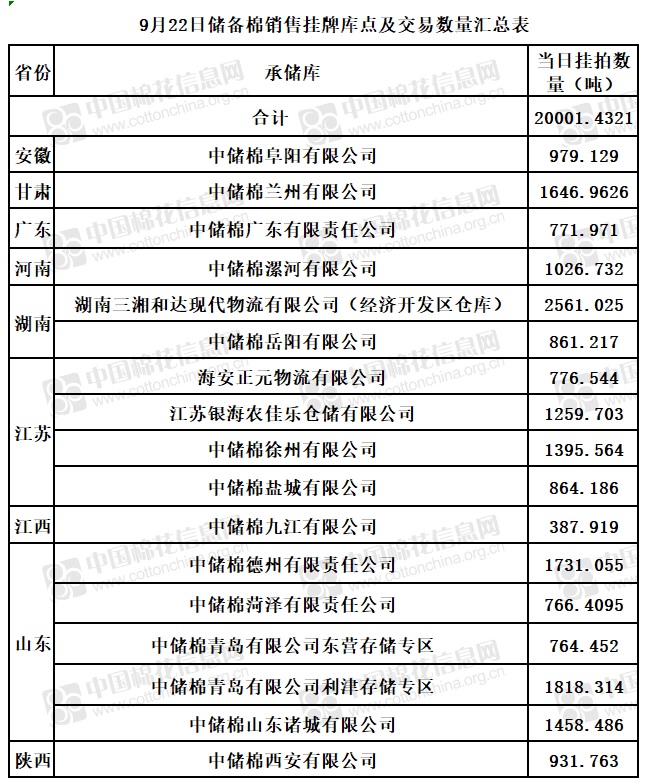 中國(guó)儲(chǔ)備棉管理有限公司定于9月22日通過(guò)全國(guó)棉花交易市場(chǎng)上市銷售儲(chǔ)備棉重量20001.4321噸,共63捆。具體庫(kù)點(diǎn)及數(shù)量見(jiàn)下表。