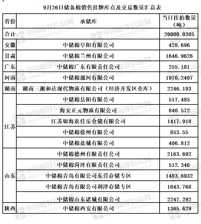 中國儲備棉管理有限公司定于9月26日通過全國棉花交易市場上市銷售儲備棉重量20000.0305噸,共60捆。具體庫點及數(shù)量見下表。