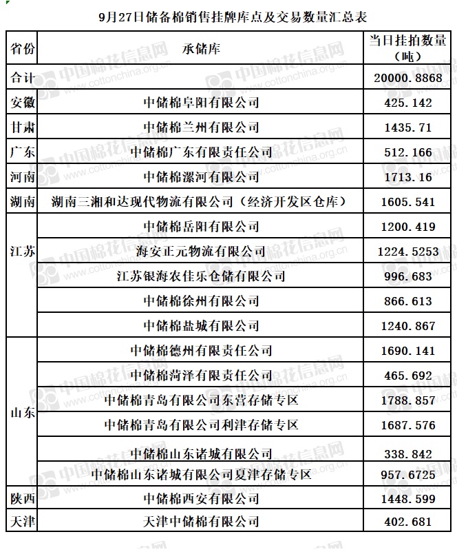 中國儲(chǔ)備棉管理有限公司定于9月27日通過全國棉花交易市場上市銷售儲(chǔ)備棉重量20000.8868噸,共55捆。具體庫點(diǎn)及數(shù)量見下表。