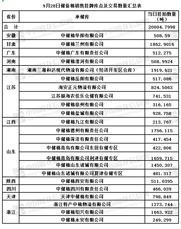 中國(guó)儲(chǔ)備棉管理有限公司定于9月28日通過(guò)全國(guó)棉花交易市場(chǎng)上市銷售儲(chǔ)備棉重量20004.7998噸,共61捆。具體庫(kù)點(diǎn)及數(shù)量見下表。