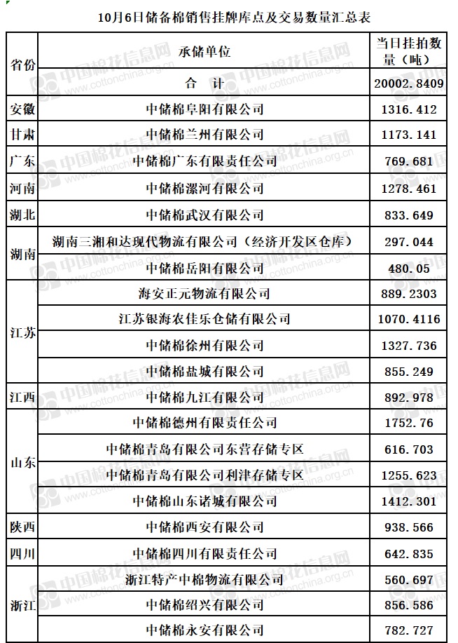 中國儲(chǔ)備棉管理有限公司定于10月6日通過全國棉花交易市場(chǎng)上市銷售儲(chǔ)備棉重量20002.8409噸,共51捆。具體庫點(diǎn)及數(shù)量見下表。