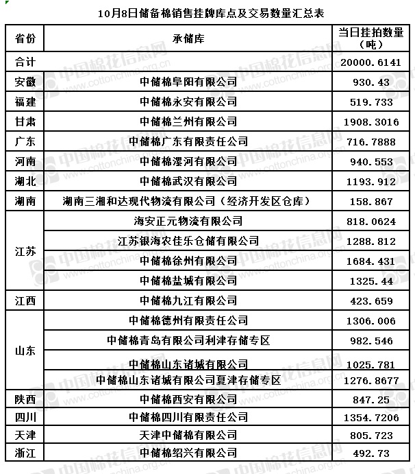 中國儲備棉管理有限公司定于10月8日通過全國棉花交易市場上市銷售儲備棉重量20000.6141噸,共56捆。具體庫點及數(shù)量見下表。