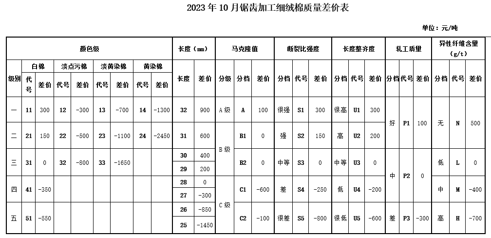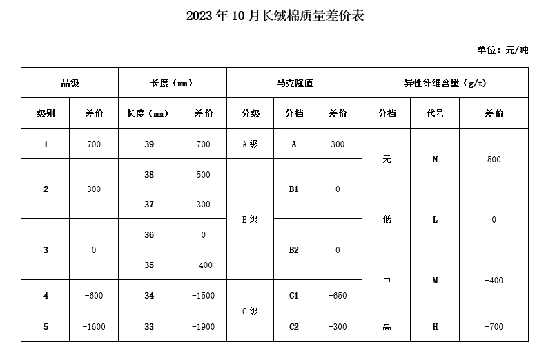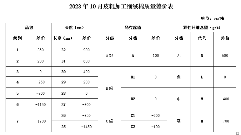 本年度因新疆霜期偏晚,新棉集中上市期較往年有所推遲,9月大規(guī)模機采、收購尚未開始,公檢質(zhì)量數(shù)據(jù)尚未有效形成。為體現(xiàn)“優(yōu)質(zhì)優(yōu)價”的原則,保證棉花在采收、收購、軋花等環(huán)節(jié)的品質(zhì),引導市場各方注重棉花質(zhì)量,并征求業(yè)內(nèi)相關(guān)專家的意見,現(xiàn)對2023年10月《中國棉花協(xié)會國產(chǎn)棉質(zhì)量差價表》做如下調(diào)整: