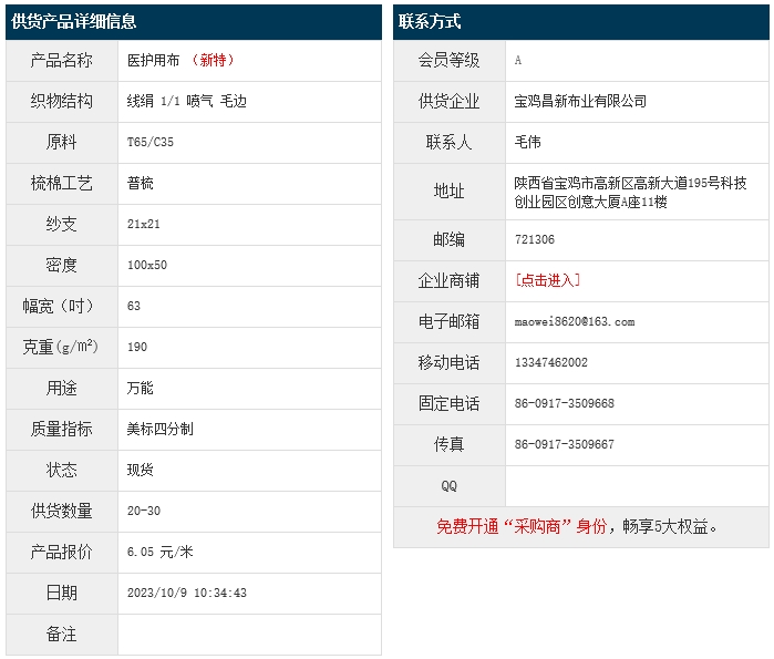 10月9日,寶雞昌新布業(yè)有限公司醫(yī)護(hù)用布滌棉線絹T65/C35 21x21 100x50 63" 1/1 190g/㎡ 噴氣 毛邊,報價為6.05元/米,實(shí)際成交價以協(xié)商為準(zhǔn)。[點(diǎn)擊查看詳情]