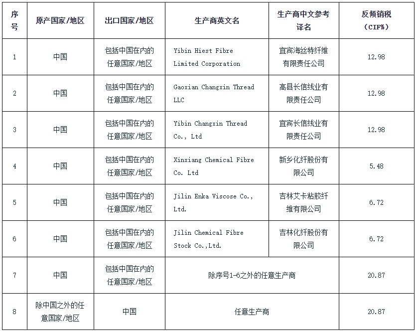2023年9月29日,印度商工部發(fā)布公告,對原產于或進口自中國的粘膠長絲紗線(ViscoseRayonFilamentYarn,VFY)作出反傾銷終裁,建議對中國涉案產品征收為期5年的反傾銷稅,稅率為CIF5.48-20.87%,征稅詳情見附表。涉案產品包括染色紗線和未染色紗線以及通過離心紡紗(PSY)和連續(xù)紡紗(CSY)工藝生產的粘膠長絲紗線,涉及印度編碼5403項下的產品。通過線軸紡紗(SSY)工藝生產的粘膠長絲紗線和印度海關編碼5401項下的用于刺繡機的即用小線軸繡花線不適用本案的反傾銷措施。