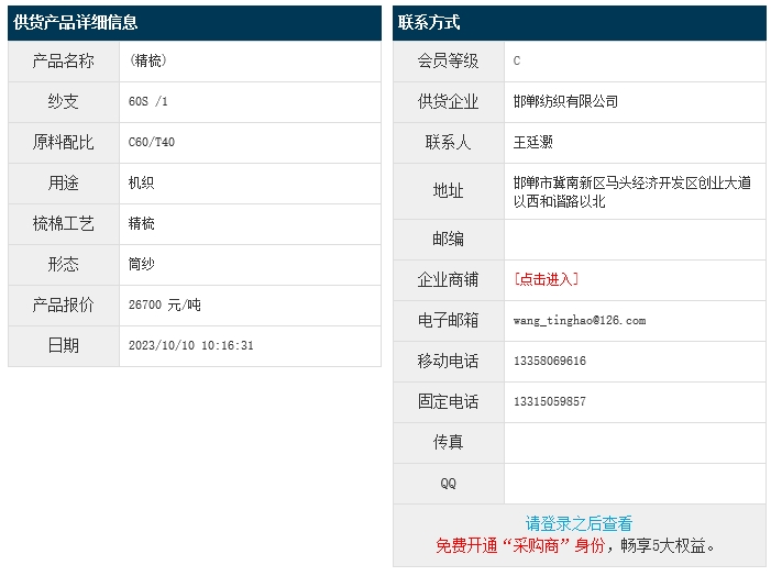 10月10日,邯鄲紡織有限公司機(jī)織用滌棉紗JCVC60/40 60S,報(bào)價(jià)為26700元/噸,實(shí)際成交價(jià)以協(xié)商為準(zhǔn)。[點(diǎn)擊查看詳情]