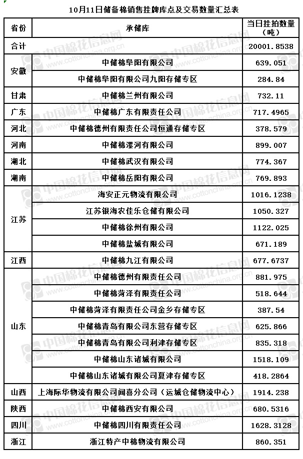 中國儲(chǔ)備棉管理有限公司定于10月11日通過全國棉花交易市場上市銷售儲(chǔ)備棉重量20001.8538噸,共62捆。具體庫點(diǎn)及數(shù)量見下表。